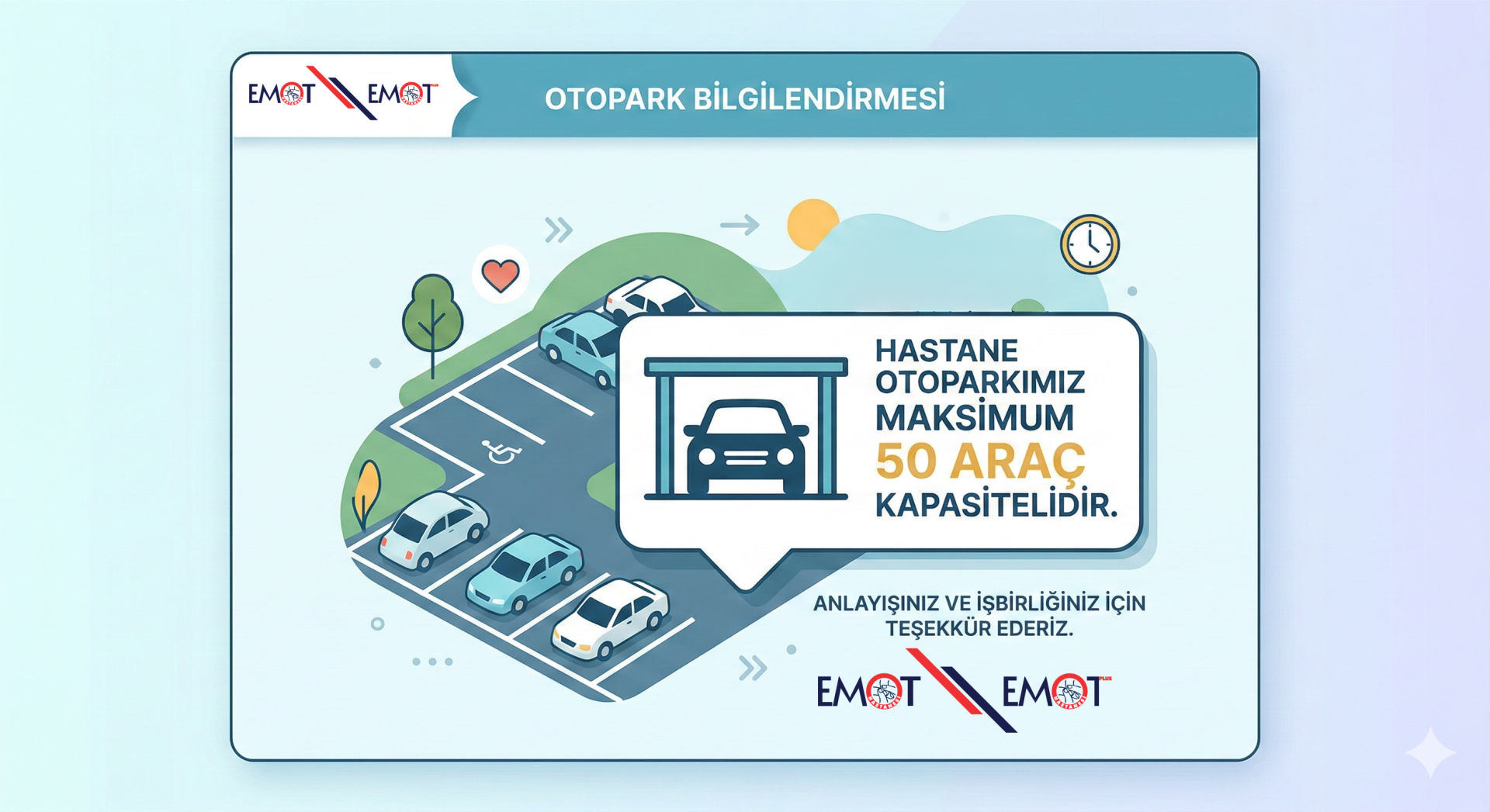 Hastanemize araçlarıyla gelen misafirlerimizin konforu ve düzenli bir hizmet sunabilmek adına, hastane otoparkımızın kapasitesi maksimum 50 araç ile sınırlıdır. Otoparkımızın dolu olması durumunda, çevredeki alternatif park alanlarını kullanmanızı rica ederiz. Anlayışınız ve işbirliğiniz için teşekkür ederiz.